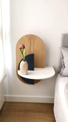 Our Della Floating bedside table is a cutting-edge, wall-mounted bedside table that boasts a futuristic aesthetic, perfect for the modern bedroom. Duco pieces with with raw solid oak wood, giving it the perfect look and feel for the space next to your bed. Composed of 3 flat pieces of Plywood and a metal bracket that is fixed on the wall. The arrangement of these pieces in the space gives the product the ability to hide objects behind the vertical pieces, since there is a separation between them.